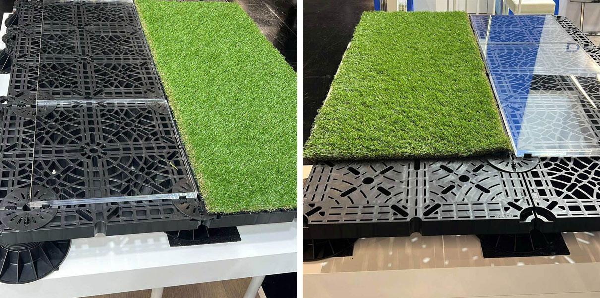 The BridgeTile permeable no fall-through safety platform system for floating floors has been specially developed to meet safety requirements for raised floating floors and walkways. The system enables installation of tiled and other floor surfaces, like artificial grass or outdoor carpeting, on to a fully supported, integrated HD plastic grid tile system.