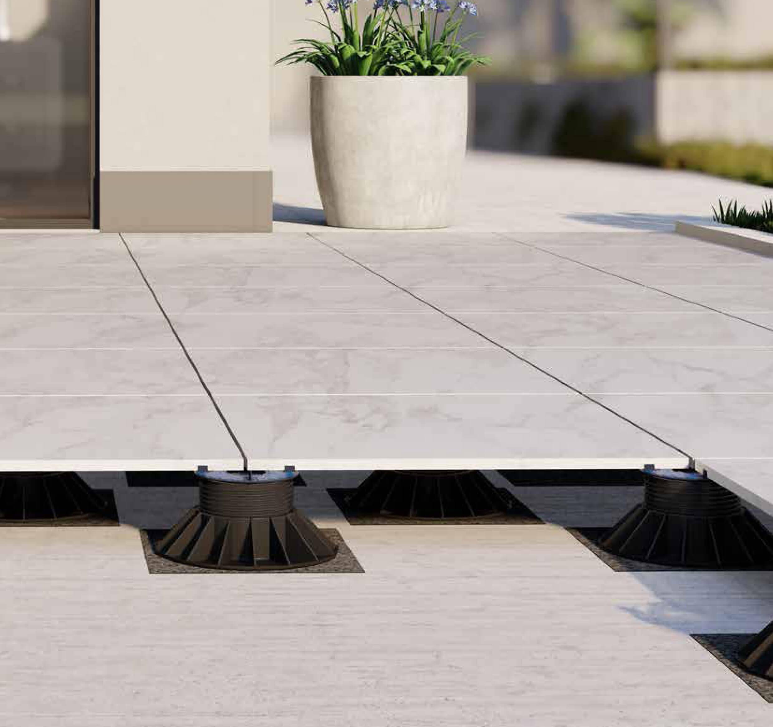 The pedestals are adjustable either from below or, for pavers, from above using the special adjustment tool.