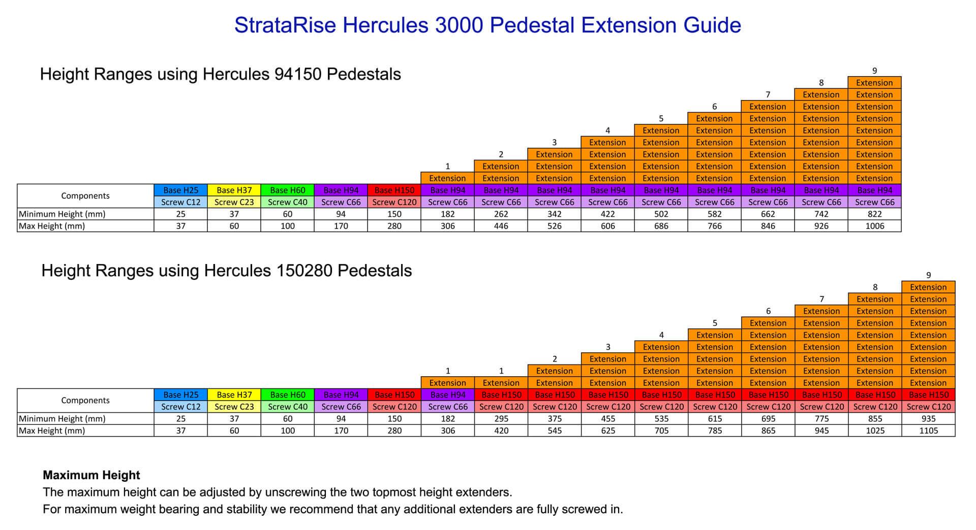 StrataRise Hercules pedestals are tested to withstand a maximum 3000 Kgf (6600 lbf). At their weakest setting, i.e. maximum height adjustment with just one thread engaged, they will support at least 1500Kgf (3300 lbf).